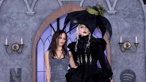 The cheeky comment came at the Graveyard Gala in New York, where attendees listened to the song for the first time in coffin-shaped booths. The event was the backdrop for Gaga’s major announcement, where she appeared with cast members like Jenna Ortega.